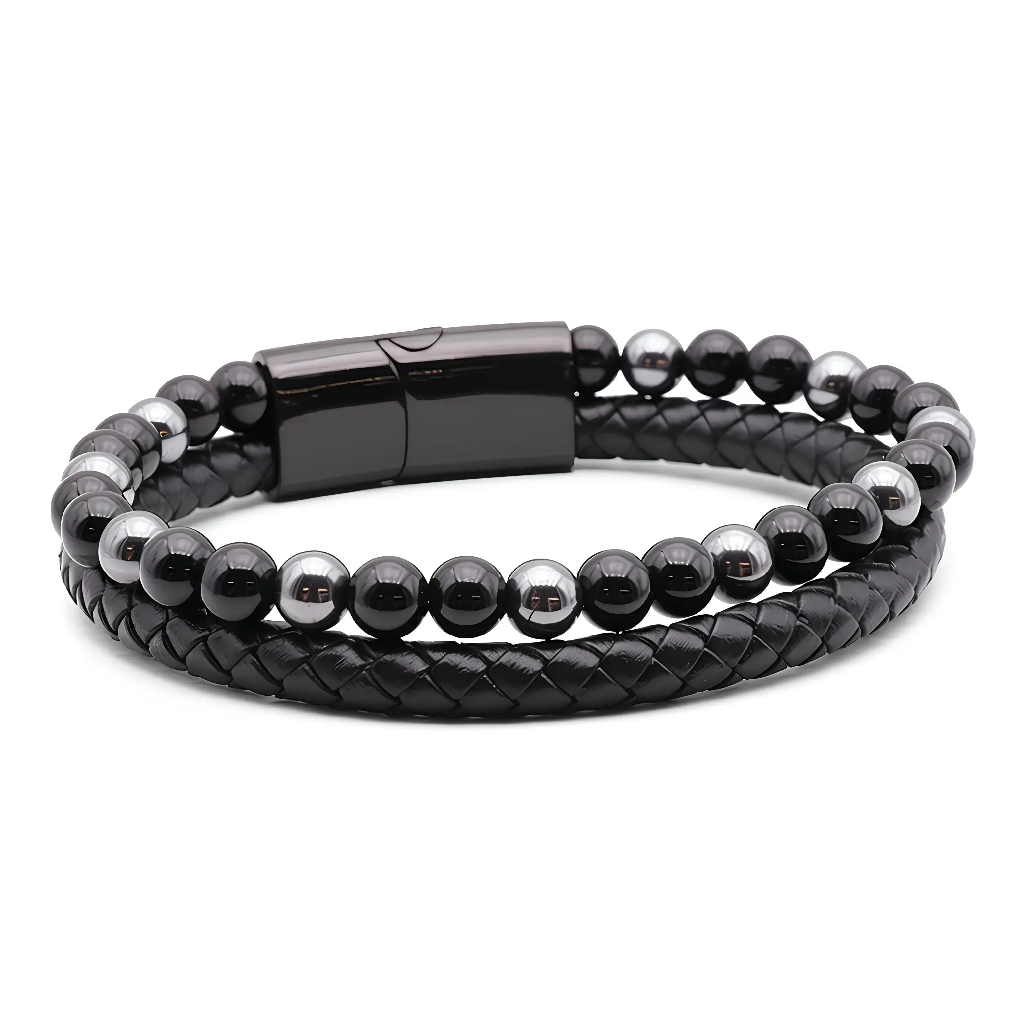 Pulseira em Couro Preto com Hematite e Ónix